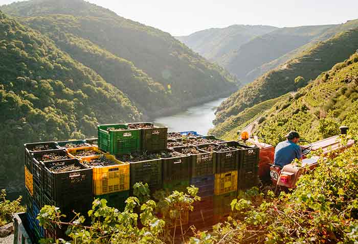 La cantina, situata nel comune di Castro Caldelas, ha vigneti con una pendenza fino al 60%. Questa caratteristica, tipica di molte zone della Ribeira Sacra, richiede un lavoro di viticoltura eroico, che si riflette in modo particolare durante la vendemmia. Per questo motivo, in questo periodo è normale vedere imbracature come unico strumento possibile per accedere ai vigneti.