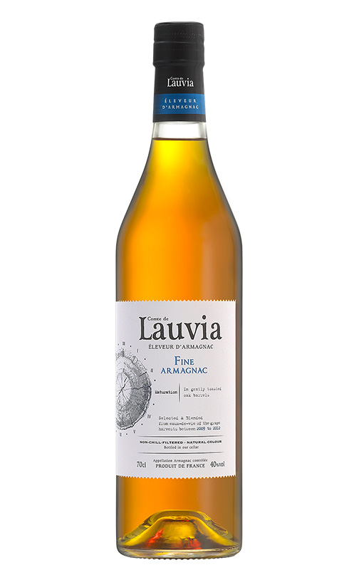 Comte de Lauvia Fine Armagnac è un distillato che nasce da un breve ma intenso contatto con il rovere, un processo di invecchiamento che finisce in vecchie botti che gli danno delicatezza e complessità. Fatto con le varietà Ugni blanc, Baco blanc e Folle Blanche, è fresco e vivace, con un profumo accattivante e complesso, sentori di vaniglia, limone e fiori di lime. Al palato è morbido e fruttato, con un finale delicato e delizioso