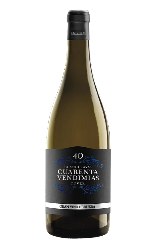 Cuatro Rayas Cuarenta Vendimias Cuvée è un vino bianco fatto con uve Verdejo che vengono da alcuni dei vigneti più vecchi e pregiati delle Cantine. Questo vino da invecchiamento ha la classificazione di Gran Vino de Rueda, stabilita dal Consiglio Regolatore della D.O. e in vigore dalla vendemmia 2020. La classificazione distingue quei vini i cui vigneti di origine hanno più di 30 anni e presentano caratteristiche di qualità uniche. Grazie all'affinamento sui lieviti e al passaggio in botte, è un bianco fresco e complesso, ideale da stappare subito o da conservare a lungo in cantina.