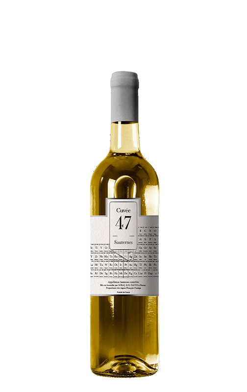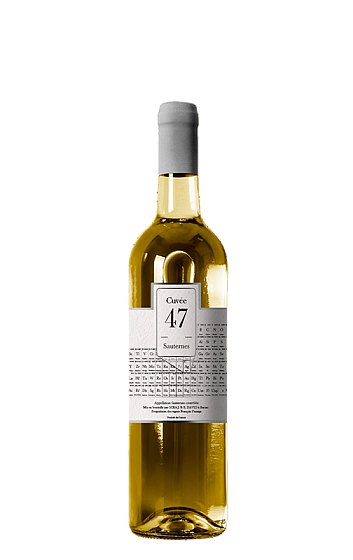 Cuvée 47 è il secondo vino di Cuvée 79 (il 47 è il numero che sta per l'argento nella tavola periodica, mentre il 79 sta per l'oro). È un vino bianco naturalmente dolce che viene dai vigneti della zona di Barsac, una delle più famose per questo tipo di produzione. È elegante ed espressivo, con un'acidità rinfrescante che ti fa venire voglia di berlo.